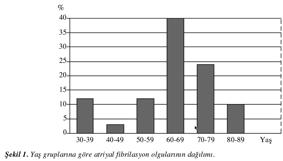 Şekil 1’de yaş gruplarına göre AF olgularının dağılımı görülmektedir. Atrial fibrilasyonlu inme olgularının 60 yaştan itibaren arttığı ve 60-69 yaşlarda pik yaptığı gözlenmiştir.