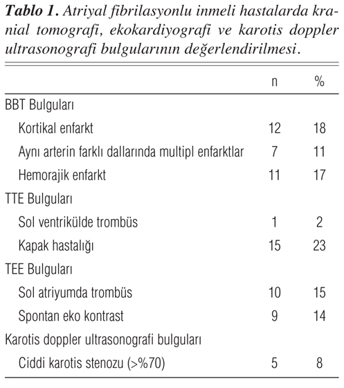 Tablo 1’de atrial fibrilasyonlu inme olgularında BBT, TTE, TEE ve karotis doppler ultrasonografi olmak üzere laboratuar bulgularının dağılımı görülmektedir.