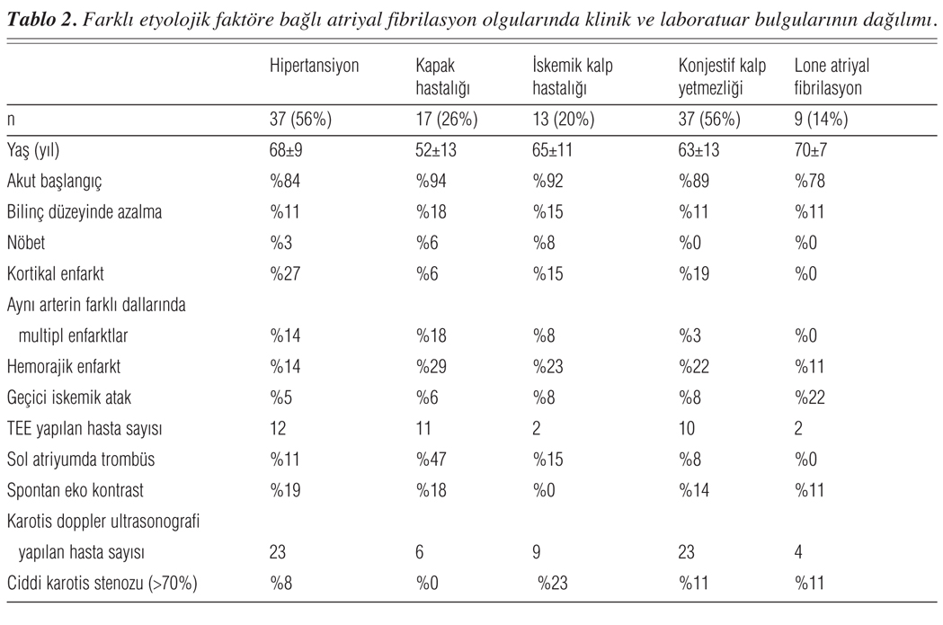 Tablo 2’de farklı etyolojilere bağlı AF’li inme olgularında klinik, BBT ve ekokardiyografi bulgularının dağılımı görülmektedir. Altta yatan etyolojik faktöre göre AF’li hastalar gruplandırıldığında, %56 hipertansiyon, %56 konjestif kalp yetmezliği, %26 kalp kapak hastalığı, %20 iskemik kalp hastalığı saptandı. %14 oranında ise ileri yaş dışında herhangi bir etyolojik faktör tespit edilmemiştir. Bu olgular “lone AF” olarak isimlendirildi. AF alt gruplarında klinik özellikler açısından bakıldığında, lone AF grubunun en ileri yaşı oluşturduğu dikkat çekmiştir. Laboratuar parametrelerinde ise, TEE’da sol atrial trombüsün kapak hastalığına bağlı AF hastalarında, sol atriumda spontan eko kontrastın gerek hipertansiyon gerek kapak hastalığına bağlı AF hastalarında, %70’i aşan ciddi karotis stenozunun iskemik kalp hastalığına bağlı AF hastalarında belirgin yüksek oranlarda saptandığı dikkat çekti.