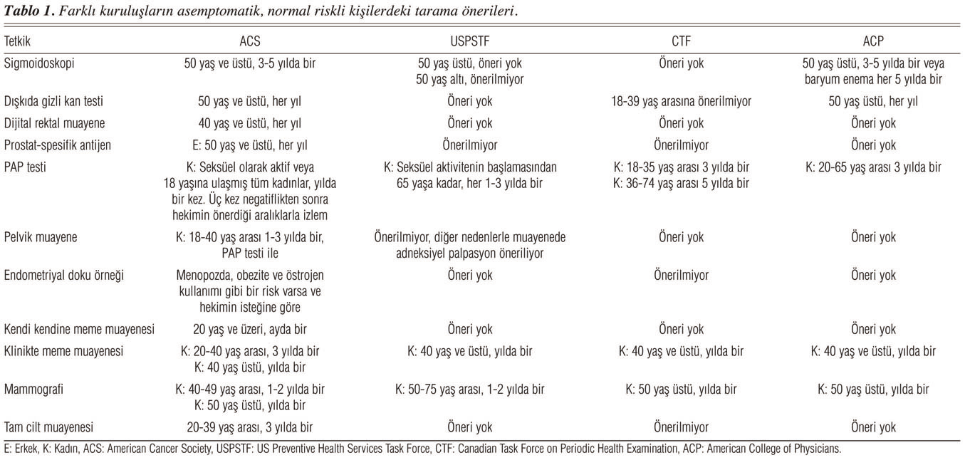 ACS, erken kanser tanısı için 20-39 yaş arası kişilerde her üç yılda bir, 40 yaş üzerindeki kişilerde de her yıl fizik muayene ve kontrollerin yapılmasını önermektedir. Bu kontroller sırasında tütün kullanımı, güneşle temas, seksüel alışkanlıklar, diyet ve beslenme alışkanlıkları, çevresel ve mesleki risk faktörleri sorulmalıdır. Kişiye meme, deri ve testislerin kendi kendine muayene yöntemleri öğretilmeli ve önemi anlatılmalıdır. Tiroid, ağız boşluğu, lenf bezleri, testis, prostat ve overler değerlendirilmelidir. Farklı kuruluşların tarama programlarıyla ilgili önerileri Tablo 1'de özetlenmiştir.