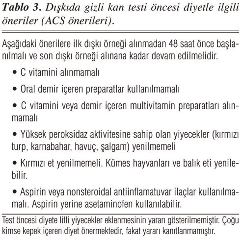 Dışkıda gizli kan tespiti için ticari olarak çok sayıda test mevcuttur. Ancak erken tanı çalışmalarında en çok kullanılan test "Hemoccult II" metodudur (Smith Kline Diagnostics, San Jose, CA). Testle dışkıdaki 0.5-1 mL'lik kan kaybı saptanabilir. Pozitif sonuç hemoglobin varlığında guaiacın fenolik oksidasyonuna dayanır (Tablo 3). Test öncesi hastaya önerilecek diyet önemlidir (Tablo 4). Diyette peroksidaz benzeri aktiviteye sahip yiyeceklerin olması yalancı pozitifliğe neden olur. Oral demir yalancı pozitifliğe, C vitamini yalancı negatifliğe neden olur. Test sonucu pozitif çıktığında, uygun koşullarda yapılmışsa tekrarlanmasına gerek yoktur. Test pozitifliğinde tüm kolon gözden geçirilmelidir, baryumlu kolon grafisi-kolonoskopi veya her ikisinin birlikte yapılması gereklidir.