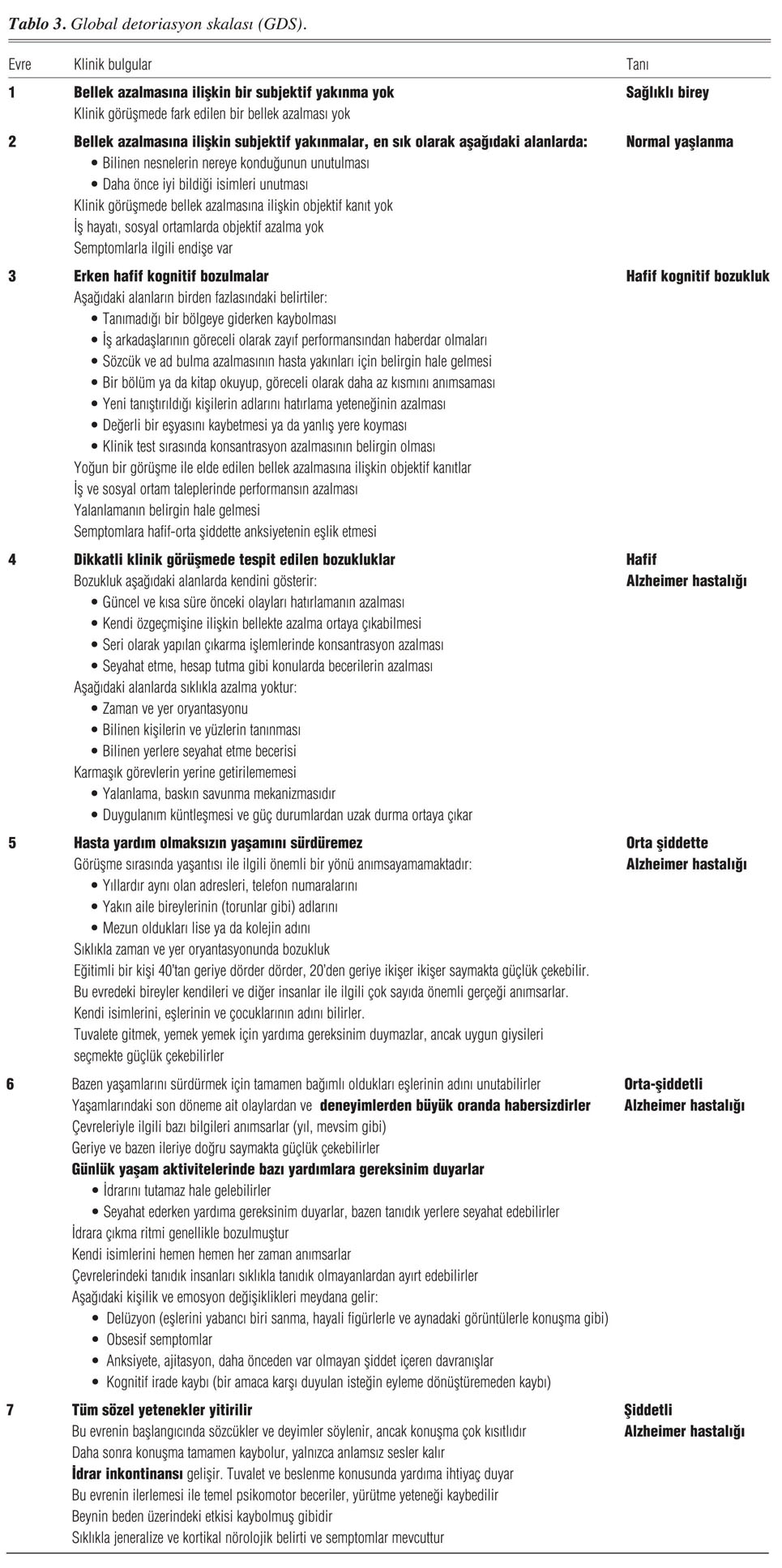 En sık kullanılan iki global evrelendirme skalasından biridir. 1982 yılında Reisberg ve arkadaşları tarafından geliştirilmiştir (9). Hastaların klinik durumu ve mental kapasitesi sorgulanarak demansı yedi evreye ayırır; bunlar sağlıklı birey, normal yaşlanma, hafif kognitif bozukluk, hafif Alzheimer hastalığı, orta şiddette Alzheimer hastalığı, orta-şiddetli Alzheimer hastalığı ve şiddetli Alzheimer hastalığı evreleridir. Ölçeğin tamamı Tablo 3'te gösterilmiştir.
