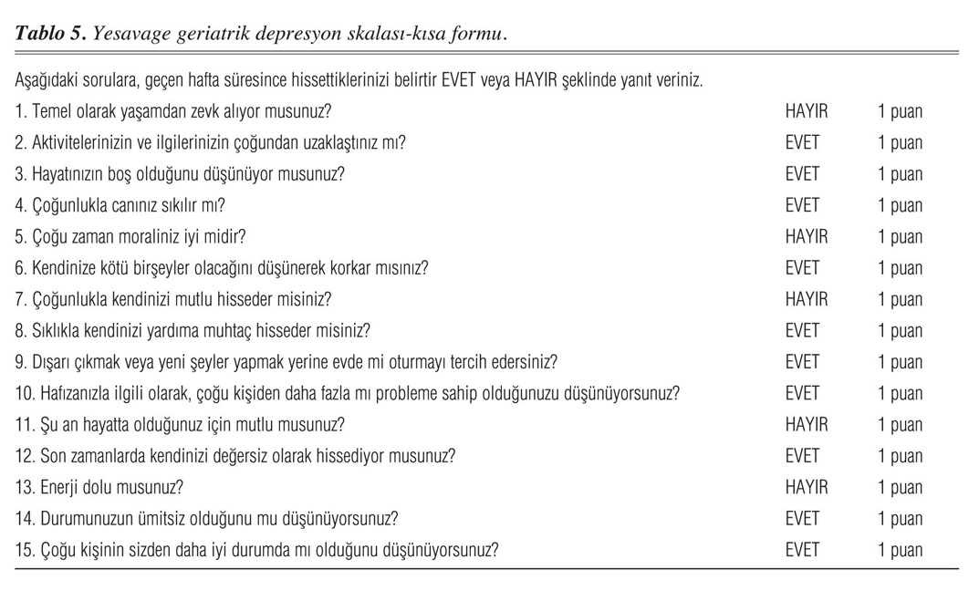 Yaşlı hastalarda depresyon taraması yapılması için 1983 yılında Yesavage ve arkadaşları tarafından geliştirilmiştir (11). 1991 yılında ise kullanım kolaylığı açısından Burke ve arkadaşları tarafından 15 soruluk kısa formunun geçerliliği ve güvenilirliği kanıtlanmıştır (12). Geriatrik depresyon skalası-kısa formu hızlı ve kolay uygulanabilir bir tarama testidir. Beş puan üzeri depresyonla uyumlu olabilir, hastanın kliniğiyle değerlendirilmesi gerekir. Demanslı hastalara uygulanabilir olması bir avantajıdır. Testin Türkiye'deki geçerlilik ve güvenilirliği Ertan ve Eker tarafından 30'u depresyonlu 276 hasta üzerinde 2000 yılında araştırılmış ve Türkiye'deki depresyonun taramasında kullanılmasında güvenilir olduğu saptanmıştır (13). Geriatrik depresyon skalasının kısa formu Tablo 5'te gösterilmiştir.