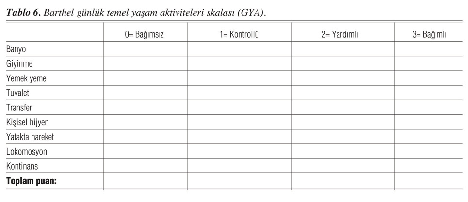 Barthel'in GYA ölçeği: Bu alanların test edilmesi için geliştirilen ve en sık kullanılan ölçek Barthel'in GYA ölçeğidir (19). Bu testin amacı, hastanın günlük işlerinde ne yaptığını kaydetmektir. Hastanın ne yapabileceğini öğrenmek hedeflenmemiştir. Değerlendirilen işler gaita kontinansı, idrar kontinansı, beslenme, yıkanma (yüz yıkama, saç bakımı, tıraş), giyinme, transfer, tuvalet kullanma, mobilite, basamak çıkma ve banyodan oluşmaktadır. Hastanın bu işleri bağımsız veya yardımlı yapmasına göre puanlanır. Alınan skor bağımsızlık derecesini gösterir, ne kadar az puan alınırsa temel GYA'lar o kadar bağımsız yapılmaktadır. Testin tamamı Tablo 6'da gösterilmiştir.