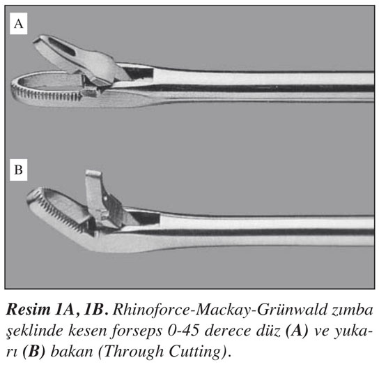 • Rhinoforce-Mackay-Grünwald zımba şeklinde kesen forseps 45 derece yukarı bakan (Through Cutting) (Resim 1B),