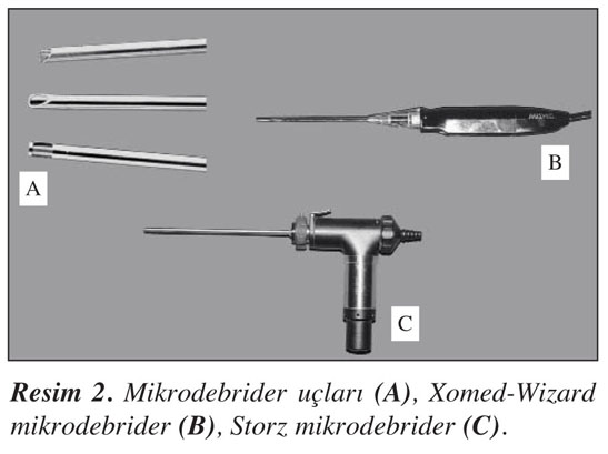 Mikrodebrider kullanımı: Son yıllarda kullanıma giren ve mikrodebrider adı verilen motorlu aletler sayesinde aynı anda hem rezeksiyon hem de aspirasyon yapılmaktadır. Bu aletler hem tek yönde dönebilmekte hem de çift yönde (osilasyonlu) dönme yapabilmekte ve dokuyu kesip aspirasyon yoluyla ortadan uzaklaştırmaktadır. Aspirasyon yapabilmekte, özellikle kanamanın çok olduğu nazal polipozis olgularında görüş alanının temiz olmasını sağlayarak rahat bir rezeksiyona olanak sağlamaktadır. Öte yandan traşlama özellikleri sayesinde de ödemli mukozanın yüzeyini alarak bazal tabakaya zarar vermeden rezeksiyon yapmaları nedeniyle mukoza korunmaktadır. Bu mikrodebriderlerin yeni jenerasyonlarında açılı uçlar da kullanılmaktadır. Bu açılı uçlar sayesinde gerek nazofrontal reses gerekse de maksiller sinüs içerisinde çalışma olanağı sağlanmaktadır. Ancak, bu cihazların pahalı olması ve bazı tiplerinin uçlarının tek kullanımlık olması en önemli dezavantajlarıdır (Resim 2).