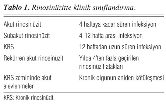 Rinosinüzit, sürecine göre beş ana grup altında incelenmektedir (Tablo 1).