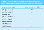 Altmış beş hasta serumunda İFE uygulandı. Bunlardan 20 hasta serumunda monoklonal protein (M-protein) saptandı. Bu M-protein bulgularının dağılımı Tablo 1'de verilmektedir.