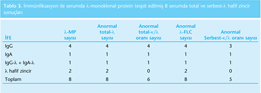 İFE ile λ-tipi monoklonal protein olan 8 serumun, tamamı hem anormal total-λ değeri hem de anormal λ-FLC gösterdi. Anormal total-κ/λ oranı ise, 8 hastadan 6'sında görüldü. Anormal serbest-κ/λ oranı ise, 8 hastadan sadece 5'inde görüldü (Tablo 3).
