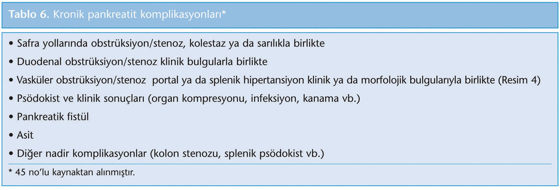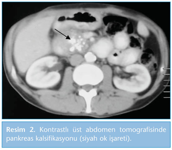 Kronik pankreatit, pankreasta kalıcı yapısal değişikliklere, endokrin ve ekzokrin fonksiyon bozukluklarına sebep olan inflamatuvar bir durumdur. Kronik ve kontrol altına alınamayan karın ağrısı bu sürece eşlik etmektedir. Son 30 yıl içerisinde tanı yöntemlerindeki gelişmeler ile birlikte kronik pankreatit tanısı daha sık konulmaktadır. Kronik pankreatit tanısı için değişik testlerden yararlanılırsa da tek başına tanısal değeri yüksek olan bir test yoktur. Kronik pankreatit tedavisinde komplikasyonlara yönelik endoskopik ve cerrahi yöntemlerin yanında ağrı palyasyonu ve emilim bozukluklarına yönelik replasman gibi medikal tedavi yaklaşımları da bulunmaktadır. ETYOLOJİ Kronik pankreatit, klinik olarak akut pankreatite çok benzediğinden ve değişik klinik prezantasyonlarla karşımıza çıktığından tanısı gecikmekte ve bazen de doğru tanı konulamamaktadır. Bu nedenle hastalığın gerçek prevalansı tam olarak bilinmemektedir (1,2). Japon çalışma grubu prevalansı kadınlarda 12/100.000, erkeklerde ise 45/100.000 olarak bildirmektedir (3). Tanı genellikle 35-55 yaşlar arasında konur. Çalışmaların çoğunda kronik alkol kullanımının olguların 2/3'ünden sorumlu olduğu gösterilmiştir. Bu hastaların çoğu 6 ile 12 yıl kadar her gün en az 150 g alkol tüketmektedir (3,4). Etyolojide genetik hastalıklar (örn. kistik fibrozis) ve anatomik defektler çocuklarda daha sık görülmektedir (5). Tablo 1'de TIGAR-O klasifikasyonu ile kronik pankreatit için risk faktörleri belirtilmiştir (6,7). PATOFİZYOLOJİ Hastalığın karakteristik özellikleri: İnflamasyon, glandüler atrofi, duktal değişiklikler ve fibrozistir (7,8). Toksinler ve oksidatif stres akut pankreatit tablosunu ortaya çıkarmaktadır. Eğer bu etki devam ederse profibrotik hücre olan satellit hücrelerin erken veya geç faz inflamatuvar yanıtı meydana gelmektedir. Bu durum kollajen birikimi, periasiner fibrozis ve kronik pankreatit ile sonuçlanmaktadır (2,5,9,10). İdiyopatik kronik pankreatit ile birlikte olan bazı genetik mutasyonlar tanımlanmıştır (2,5,10). Katyonik tripsinojen gen (proteaz serin 1 ya da PRSS1) mutasyonu, kistik fibrozis kondüktans regülatör gen mutasyonu, serin proteaz inhibitor kazai tip 1 (SPINK) gen mutasyonu bunlardan bazılarıdır (11,12,13,14,15,). Otoimmün pankreatit, tüm kronik pankreatit olgularının %5-6'sını oluşturur. İnsidans özellikle Japonya'da artış göstermektedir (16). Hastalık lenfositik infiltrasyon, fibrozis ve pankreatik disfonksiyon ile karakterizedir (17). Görüldüğü üzere kronik pankreatit multifaktöriyel bir hastalıktır, hastalığın ortaya çıkışında iki mekanizma sorumlu tutulmaktadır. Birinci mekanizma; fonksiyonel ya da mekanik bir nedenin pankreatik bikarbonat sekresyonunu azaltmasıdır. Fonksiyonel nedenler genetik mutasyonlar zemininde ortaya çıkarken mekanik nedenler ise; tümör, striktür ya da oddi sfinkter disfonksiyonu sonucu olabilir (18). İkinci mekanizma ise pankreasın ekzokrin enzimlerinin pankreas dokusu içindeki erken aktivasyonudur. Böylece interstisyel yağ nekrozu ve hemoraji ortaya çıkmaktadır. Bu mekanizmaların etkisiyle perilobüler fibrozis, kanallarda şekil bozukluğu ve pankreatik sekresyonda değişiklik oluşmaktadır (8). KLİNİK BULGULAR Hastalar tekrarlayan akut pankreatit atakları ile karşımıza çıkabilir. Bu durum kronik abdominal ağrı ile sonuçlanabilir (7). Ağrı genellikle epigastriumdan sırta doğru yayılan ve oral alım ile artan karakterdedir. Bulantı ve kusma ağrıya eşlik edebilir, öne doğru eğilmeyle ağrı azalabilir (8). Pankreatik yetersizlik ortaya çıkmış olan bazı hastalarda ağrının spontan olarak ortadan kalkması "pankreatik burn-out" (Pankreatik tükenme) teorisi ile açıklanır (2,19,20). Hastalar steatore, malabsorpsiyon, vitamin eksikliği (A, D, E, K, B12), diyabet ya da kilo kaybı nedeniyle başvurabilir (1,4,19,21). Hastaların %10-20'si ağrı olmadan yalnızca ekzokrin yetersizlik tablosunda karşımıza gelebilir (1,4). AYIRICI TANI Etyolojisi aydınlatılamayan akut ya da kronik karın ağrısı olan hastalarda kronik pankreatit ihtimali akılda tutulmalıdır. Serum amilaz ve lipaz seviyesinin yükselmesi spesifik değildir (7). Bu enzimlerdeki yükselme; mezenter iskemisi, biliyer hastalıklar, peptik ülser komplikasyonları ve renal yetmezlik tablolarında da görülebilir. Tablo 2'de kronik pankreatit ayırıcı tanısı özetlenmiştir (2,4,22,23). TANI TESTLERİ Kronik pankreatitin ileri evrelerinde tanı klinik bulgular ve görüntüleme yöntemleriyle konulmaktadır. Erken evrede spesifik bir tanı testi yoktur. Her test hasta açısından riskleri ve yararları göz önüne alınarak değerlendirilmelidir. Tablo 3'te kronik pankreatit tanısında kullanılan testler özetlenmiştir (1,2,5,17,22,23.24). 1. Laboratuvar Testleri Akut pankreatit atakları sırasında pankreatik enzim seviyeleri tipik olarak normalin üst sınırının üç katı veya daha fazla artmaktadır (22,23). Ancak ataklar arasında olguların çoğunda serum amilaz ve lipaz seviyeleri normal ya da hafif yükselmiş olarak bulunur (1). Biliyer obstrüksiyon meydana gelen hastalarda sarılık, serum alkalen fosfataz ve transaminaz seviyelerinde artış saptanabilir (22). Pankreatik fonksiyon testleri tanı için spesifik değildir ve yapılması oldukça güç olduğu için rutin olarak tavsiye edilmezler (1,2,5,19,24,25). Sekretin stimülasyon testi bu testler içinde en spesifik olan testtir (7). 2. Görüntüleme Yöntemleri a. Ayakta direkt karın grafisi: Pankreasta kalsifikasyon saptanması patognomonik bir bulgudur (7). b. Kontrastlı abdomen tomografisi: Kronik pankreatit şüphesi olan hastalarda ilk olarak istenmesi gereken radyolojik incelemedir. Sensitivitesi %75 ile %90 arasında değişirken spesifisitesi %85'tir. Kalsifikasyon, psödokist, tromboz, psödoanevrizma, nekr