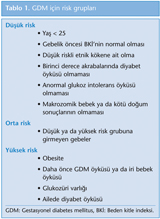 Çeşitli derneklerin farklı önerilerinden de anlaşılacağı üzere GDM'de tarama zamanı, kimlere tarama yapılacağı ve tanı kriterleri tartışma konusudur. Tarama, risk kategorisine göre önerilmektedir. Buna göre hastalar düşük, orta ve yüksek risk grubunda değerlendirilmektedir (Tablo 1) (6).