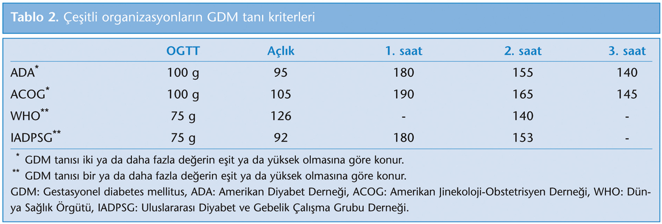 Çok sayıda farklı öneri bulunmakta olup GDM için OGTT sınır değerleri çeşitli organizasyonlara göre Tablo 2'de verilmiştir (6,14,16,17,18). Tüm hastaların tek basamaklı yaklaşımla 100 g OGTT ile taranması maliyet ve zaman açısından dezavantajlı olup, 50 g OGTT sonrası test sonucu pozitif çıkan gebelere uygulanması daha uygun gözükmektedir. Bununla birlikte yüksek riskli gebelere tanı anından itibaren 100 g OGTT uygulanabilir. Tarama testlerinde eşik değer olarak ise ADA önerileri doğrultusunda Coustan ve Carpenter kriterlerinin uygulanması daha uygun gözükmektedir. Gerek DSÖ gerekse IADPSG konsensus kriterlerini temel aldığımızda GDM insidansı belirgin şekilde artmakta olup, bu oranlar %17.8 gibi oldukça yüksek düzeylere ulaşmaktadır. Bu durumda DSÖ ve IADPSG'ye göre tedavi edilmesi gereken hasta sayısı ciddi oranlara ulaşmaktadır. Ayrıca, ADA ve DSÖ kriterlerine göre glisemik değerler temel alındığında maternal ve fetal klinik sonuçların (makrozomi, preeklampsi ve neonatal ölüm) değerlendirildiği bir çalışmada testler arasında fark bulunmamıştır (20). Yine DSÖ ve IADPSG'ye göre hastaları tedavi ettiğimiz takdirde fetal ve maternal klinik sonuçlar ile ilgili yeterli veri bulunmamaktadır.