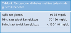 Tedavi hedefleri, normogliseminin sağlanarak fetal ve maternal mortalite ve morbiditenin azaltılmasıdır. Hedef kan şekeri değerleri Tablo 4'te verilmiştir. Tokluk kan şekeri düzeyi en güçlü fetal makrozomi göstergesi olup, takipte önemlidir (29).