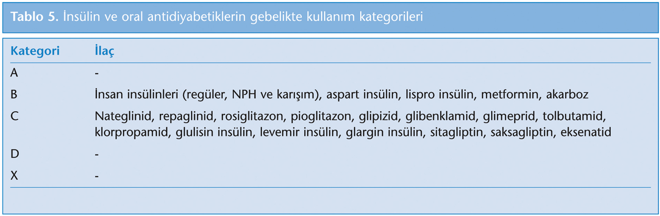 1. Oral antidiyabetikler (OAD): Gebelikte OAD kullanımı çeşitli hayvan deneyleri ve insan çalışmalarında fetal anomali ve diğer yan etkilerin gösterilmesi nedeniyle önerilmemektedir. Bununla birlikte son çalışmalar bazı OAD'lerin gebelikte kullanılabileceği yönündedir. Gebelikte OAD kullanımıyla ilgili göz önünde bulundurulması gereken temel durumlar; fetal anomaliler, neonatal hipoglisemi ve preeklampsi gelişimidir. OAD'lerin ve insülinlerin gebelik kategorileri Tablo 5'te verilmiştir.