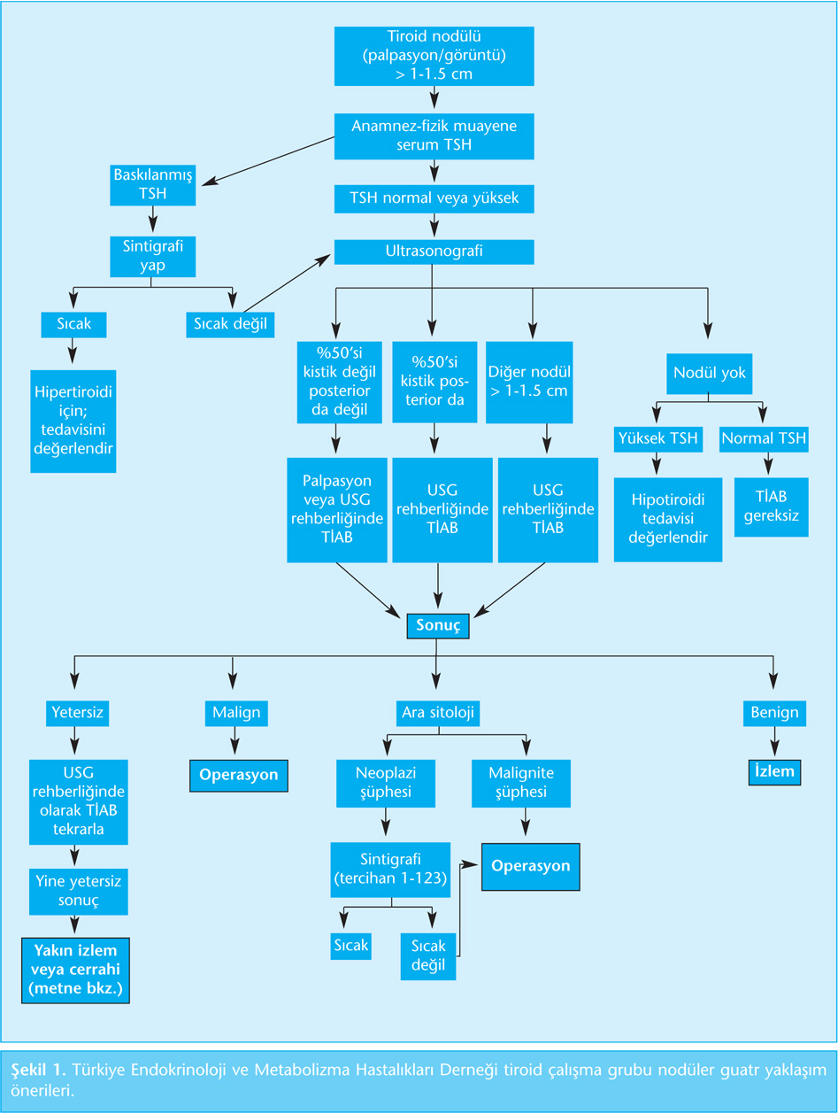 TİAB sonucu benign gelmesine rağmen nodülleri büyük ve bası semptomlarına yol açan hastalar cerrahiye yönlendirilmelidir. Palpabl nodülleri olan ve ilaçsız takip önerilen hastalara nodülün otonomi kazanmasının engellenmesi yönünden iyot kısıtlaması da önerilmelidir. USG takipleri başlangıçta 3-6 ay sonra yapılabilir. Takiplerde nodül boyutlarında anlamlı artış saptanıldığında TİAB tekrarı uygundur. Yeterli sürede nodül boyutlarında değişiklik olmadığı görüldükten sonra USG aralıkları uzatılabilir. Hastanın iki kez benign TİAB'si olmasına rağmen nodül boyutlarında artış olmaya devam ediyorsa cerrahi yönünden değerlendirilmeleri uygun olur. Öyküsünde ve USG'de tiroid kanseri yönünden kuşkulu bulgusu olmayan, boyut olarak 1 cm'den küçük nodüllerin klinik önemi halen bilinmemekte olup bunların büyüme açısından yıllık USG takibi önerilmektedir. Türkiye Endokrinoloji ve Metabolizma Hastalıkları Derneği (TEMD) tiroid çalışma grubunun 2007 yılında yayınladığı kılavuz önerileri Şekil 1'de özetlenmiştir (13).