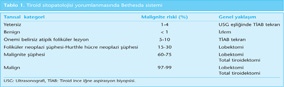 Günümüzde TİAB sonuçlarının sitopatolojik değerlendirilmesinde; sitopatologlar, endokrinologlar ve cerrahlar tarafından birlikte hazırlanan "Bethesda Sistemi" kullanılmaktadır. Bu sistemde biyopsi sonuçları altı tanısal kategoriye ayrılmıştır. Her bir kategori için olası malignite riski ve takip-tedavi önerileri belirlenmiştir (Tablo 1) (12).