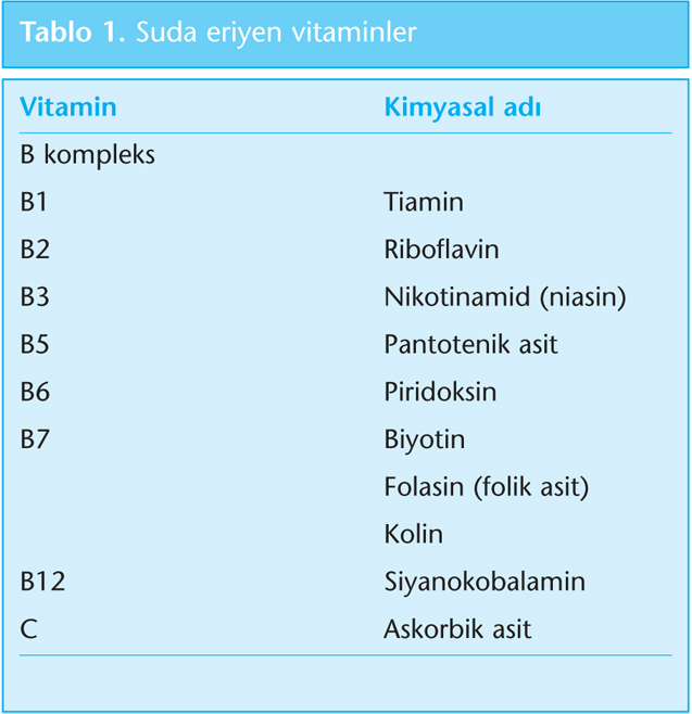 • Suda eriyen B ve C grubu vitaminlerin toksisiteleri minimaldir ve idrar yoluyla atılır (Tablo 1). Çoğunlukla ince barsaktan, bir miktar da mideden bağlayıcı proteinler aracılığıyla yüksek miktarlarda basit difüzyonla, düşük miktarlarda aktif transportla emilir. Vücuttaki miktarları kişinin beslenme durumuna, alınan gıdaların içerdiği diğer besin ve maddelere, kullanılan ilaçlara, yaşa ve mevcut hastalıklara göre değişir. Kan yoluyla karaciğere taşınır. Enerji metabolizmasında koenzim ve birçok rolleri vardır. Depolanmaları az olduğu için gereksinim fazladır. Bu, özellikle B vitaminlerinin birçoğu için geçerlidir. B kompleks vitaminleri eksik alan bir kişide bu eksikliğin belirtileri bazen birkaç günde ortaya çıkar. B12 vitamini bunun dışındadır, çünkü karaciğerdeki B12 vitamini deposu kişiye bir yıl veya daha uzun süre yetebilir. C vitamininin yokluğu ise birkaç haftada belirtilerin ortaya çıkmasına yol açabilir (2,3,5).