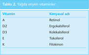 • Yağda eriyen A, D, E, K vitaminleri toksik olabilir ve depolanabilir (Tablo 2). Bu vitaminler yağlarla birlikte emilir, lenfatik sisteme taşınır ve atılır. Diyette yağın az veya hiç olmaması, safra ve pankreas salgılarının eksikliği, barsaklardan emilimi engelleyen anatomik veya fonksiyonel bozukluklar bu grup vitaminlerin eksikliğine yol açar. Yağda eriyen vitaminlerin fazlası idrarla atılamaz, depolanır. Bu işlemin yeri karaciğerdir. E vitamini dışındaki yağda eriyen vitaminler uzun süre, gereğinden fazla alınırsa toksik etki yapabilir. Karaciğerde depolanan A vitamini hiç vitamin almayan bir kişi için 5-10 ay, D vitamini ise 2-4 ay yeterlidir. Hücre büyümesi, matürasyon ve gen regülasyonunda anahtar rol oynar (2,3,5).
